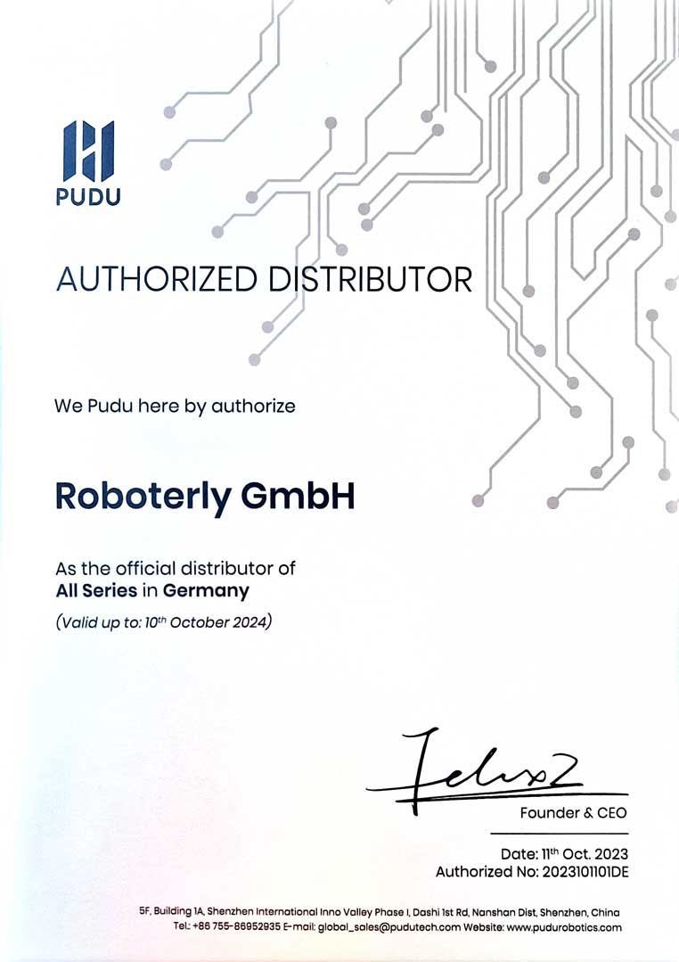 Sehen Sie hier das offizielle Zertifikat, welches Ihnen die Authentizität und Vertrauenswürdigkeit unserer Partnerschaft mit PUDU Robotics bestätigt.